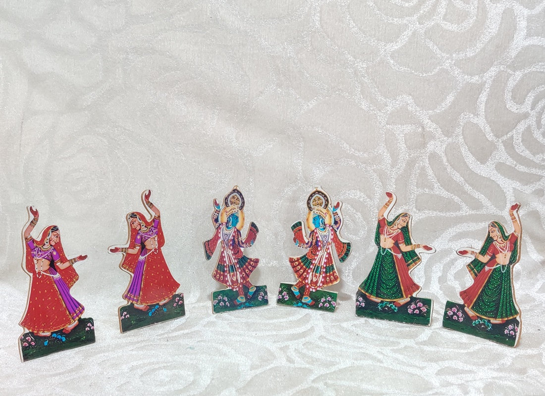 Big size Raas Leela Cut Out Set Made on Wooden Cardboard for Thakorji. Set Including 4 Krishna Cut out and 5 pairs of Gopis.